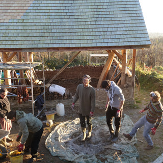 After walking around her plot, we spent the afternoon helping build the Plas Helyg guest home with the cordwood technique. This involves mixing the cob structure and then creating sausages of cob to set a lattice of wooden logs insulated with a fluffy material made from recycled water bottles. We quickly got in to the rhythm and were surprised as the sun suddenly began to set and it was time to pack up.